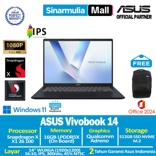 ASUS Vivobook 14 A1407QA Snapdragon X X1 26 100 512GB SSD 16GB WUXGA IPS Win11+OHS